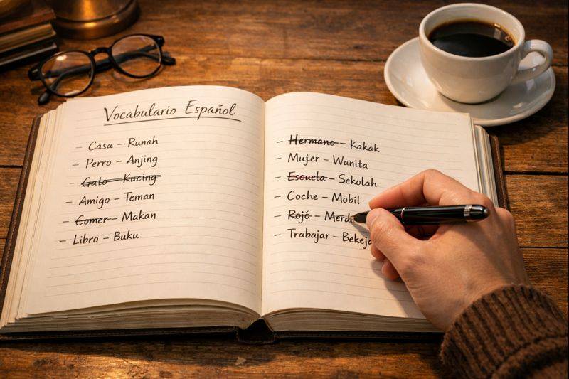 - Mulai kecil: Jangan langsung 50 kata. Mulai 15-20 kata dulu. Biarkan otak adaptasi.