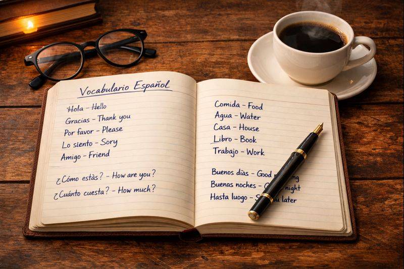 Ambil buku catatan besar. Tulis 25 kata atau frase bahasa target beserta terjemahannya. Jangan dipaksain hafal. Cukup tulis dengan nyaman. Selesai. Tidak ada target waktu.