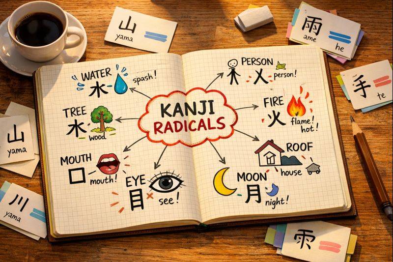 - Pahami radikal dasar dulu (1 minggu): Hafal 50 radikal paling umum. Ini foundation.