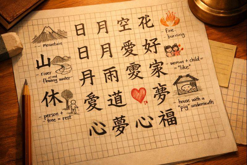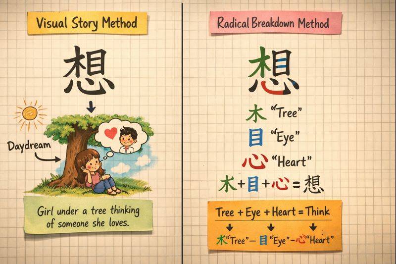 Bayangkan karakter kanji 休 (istirahat). Komponennya: 人 (orang) + 木 (pohon). Jika kau bayangkan orang yang beristirahat di bawah pohon, tiba-tiba karakter abstrak itu hidup. Ini bukan sekadar imajinasi—otak kita punya visual memory yang jauh lebih kuat daripada rote memory.